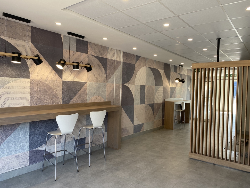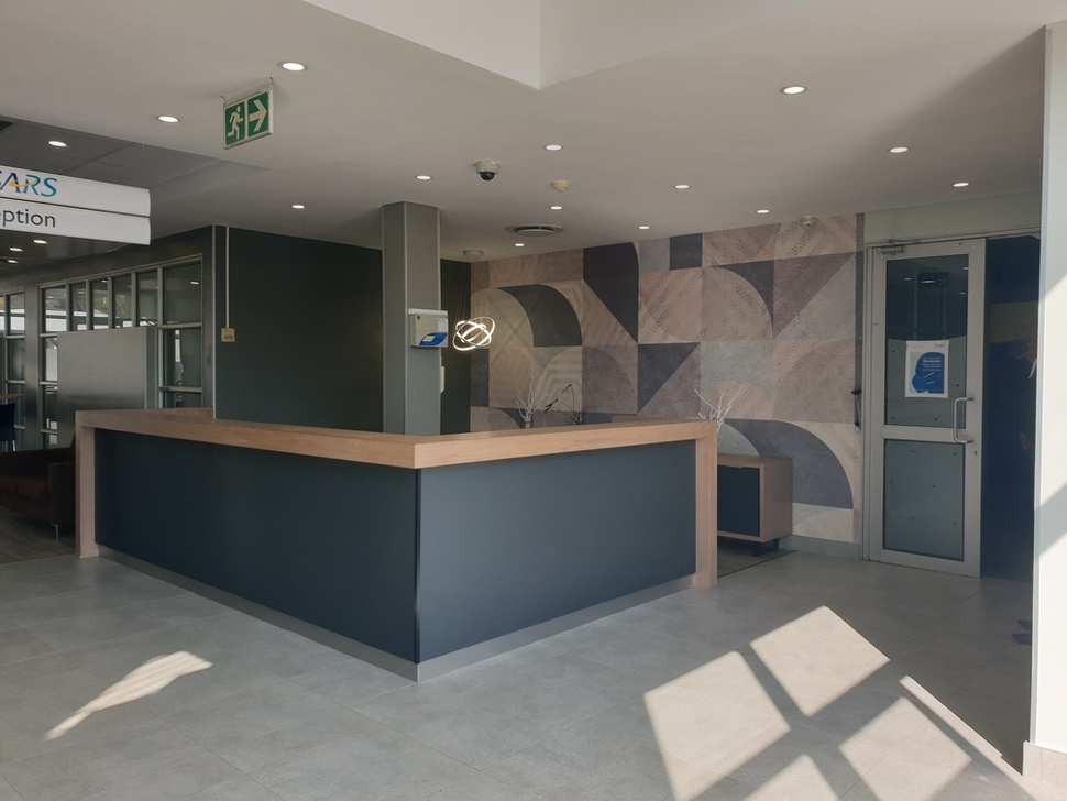 The renovation project entailed replacing the outdated internal aesthetics of the centre with a modern, A-grade finish and well-designed look and feel. Common areas received new tiling, ceilings, and aesthetic lighting fixtures as a standard improvement and new corporate furniture, including stylish wooden reception counters and seated waiting areas, were added. Key themed wall decorations were installed to add a sophisticated look to the visitors’ area and staircases with updated lighting and ceiling features were installed to enhance the refreshed space.
